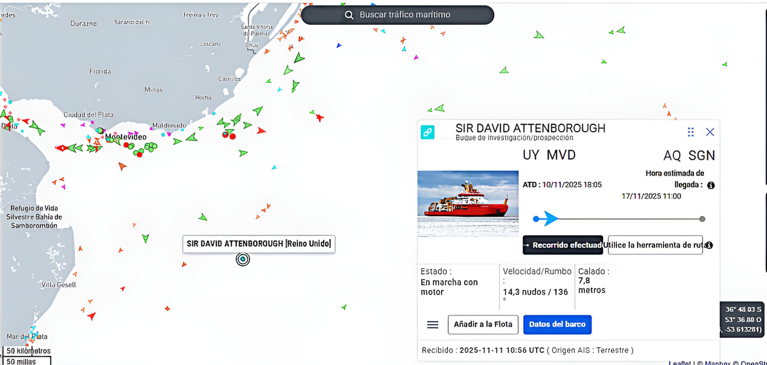 3. Ruta Actual: Tras dejar este lunes 11 Montevideo, ha ingresado en la Zona Económica Exclusiva (ZEE) argentina, navegando directamente hacia el sur, evitando las costas patagónicas, pero sin salir del área de control y soberanía económica de Argentina.