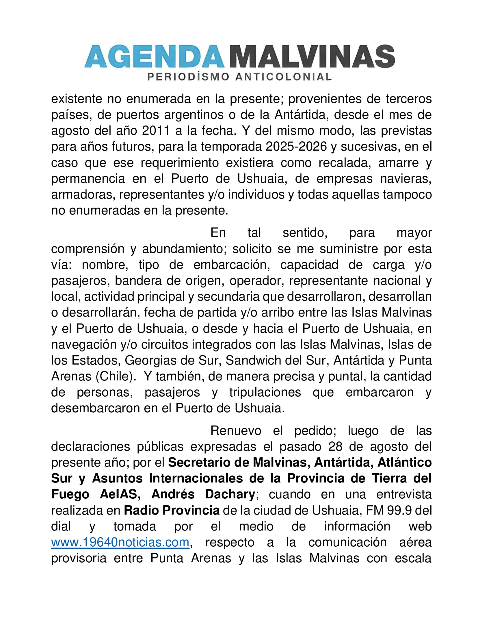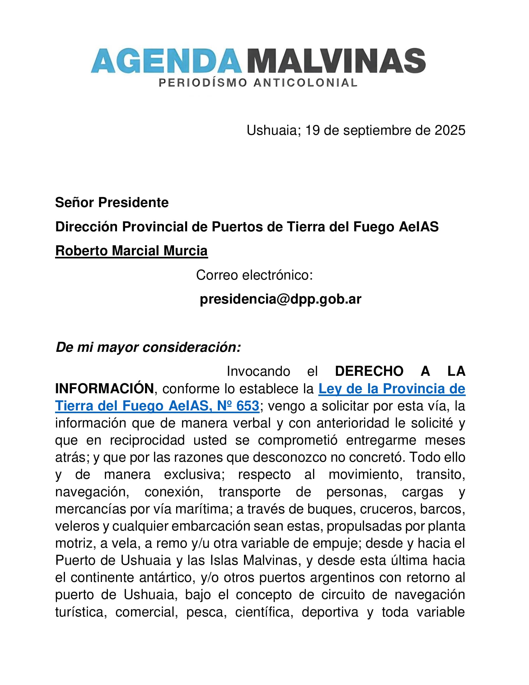 Luego de meses de solicitudes verbales y promesas incumplidas de entrega de datos por parte del funcionariado provincial, Agenda Malvinas formalizó un pedido de información por escrito al presidente de la Dirección Provincial de Puertos (DPP) de Tierra del Fuego AeIAS, Roberto Marcial Murcia. El objetivo es cuantificar y exponer el movimiento marítimo entre Ushuaia y las Islas Malvinas desde 2011 a la fecha, buscando que el Derecho a la Información rompa el silencio institucional sobre el incumplimiento de las normativas que protege la soberanía argentina.