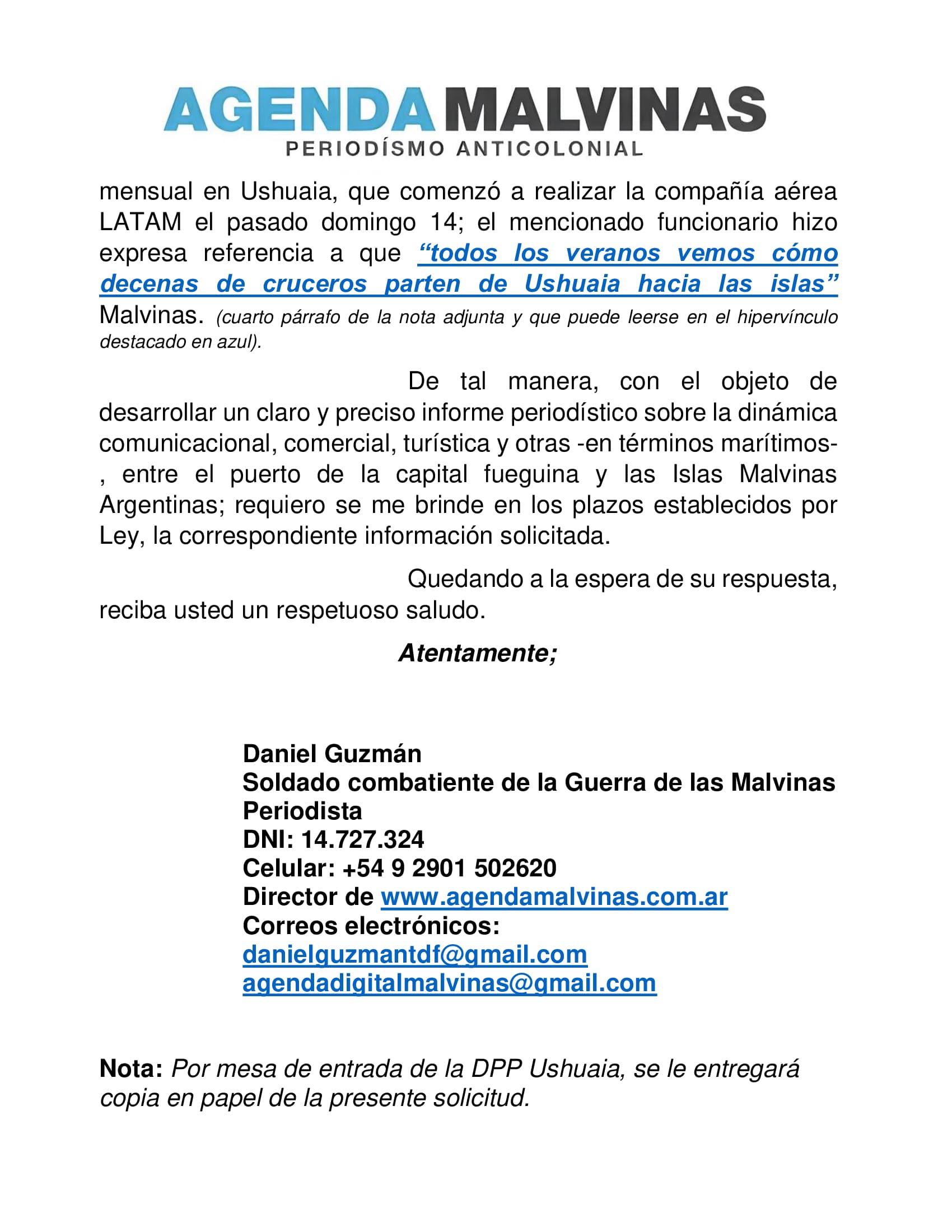 LA SOLICITUD DE TRES PÁGINAS, ENVIADA POR AGENDA MALVINAS A LA DPP