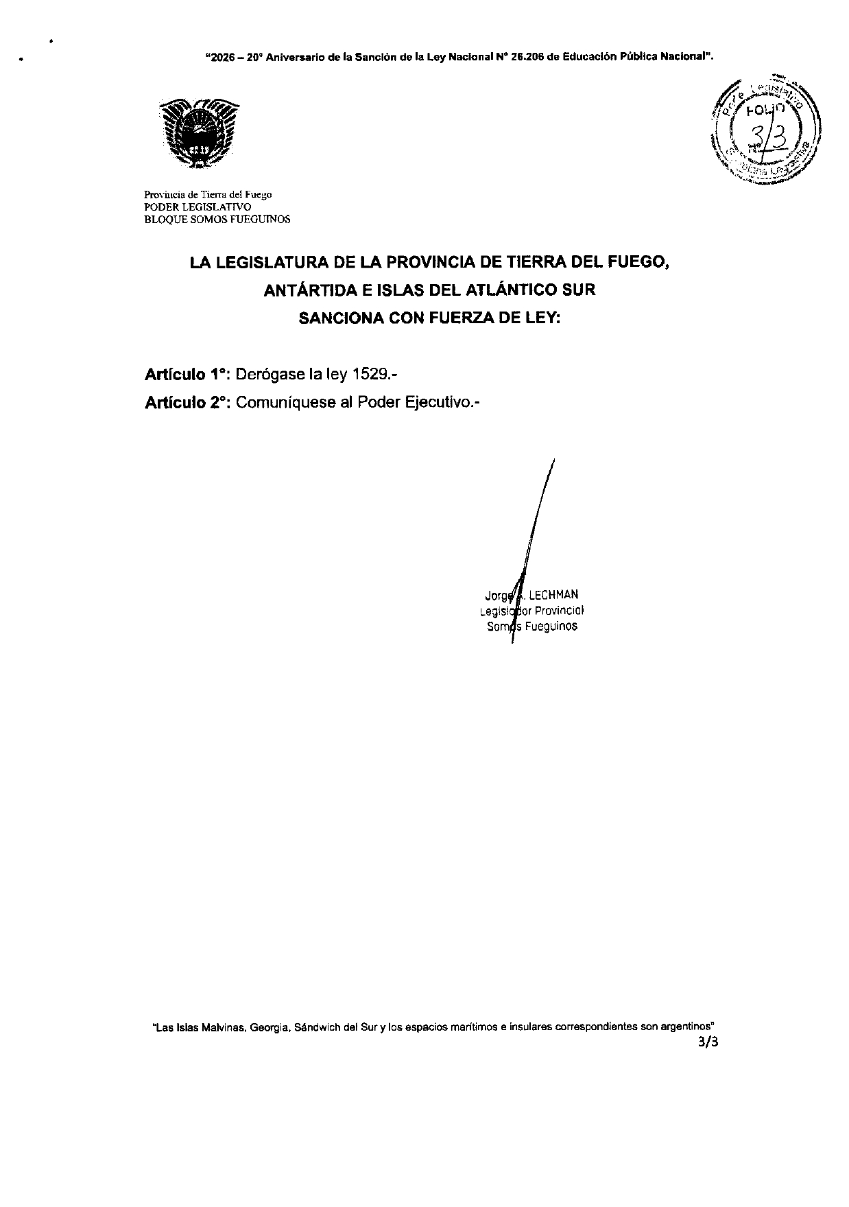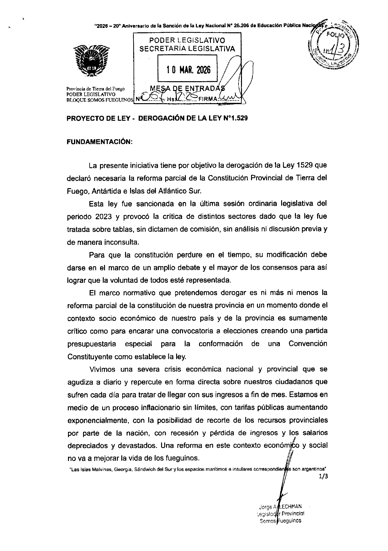En las últimas horas, el legislador Jorge Lechman (Somos Fueguinos) ingresó formalmente un proyecto de ley para derogar la Ley Provincial N° 1529. Los fundamentos del documento son lapidarios: la reforma es calificada como "inoportuna e innecesaria" ante una crisis económica que se agudiza a diario.