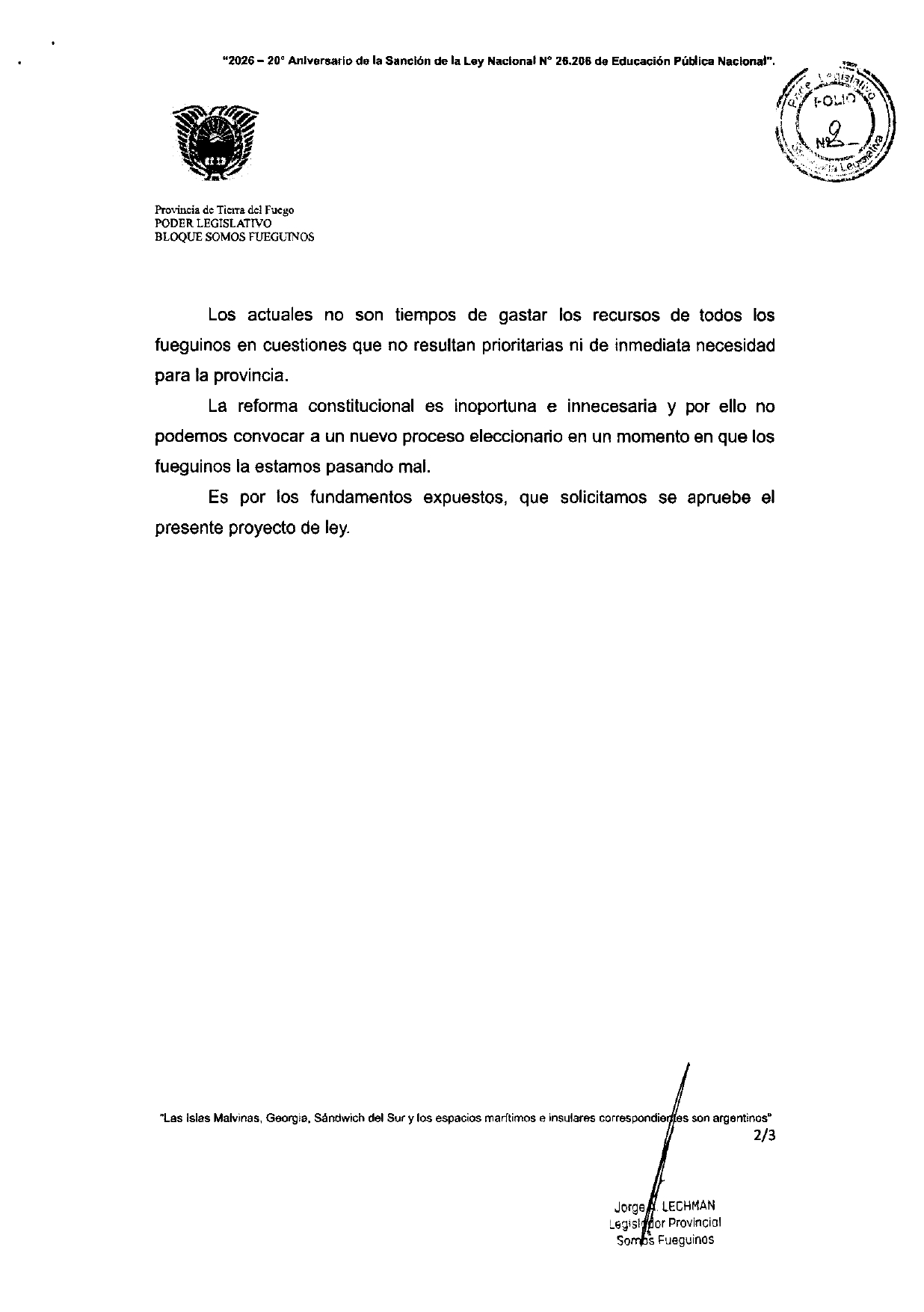 La iniciativa de Lechman ratifica la desconexión total entre las prioridades de la "clase política" gobernante y las necesidades de un pueblo que lucha por llegar a fin de mes. Tierra del Fuego no necesita una constitución a medida de un dirigente; necesita herramientas para defender su industria, su integridad territorial, la soberanía de las Islas Malvinas, los recursos naturales del Atlántico Sur y su gobernanza y legado antártico.