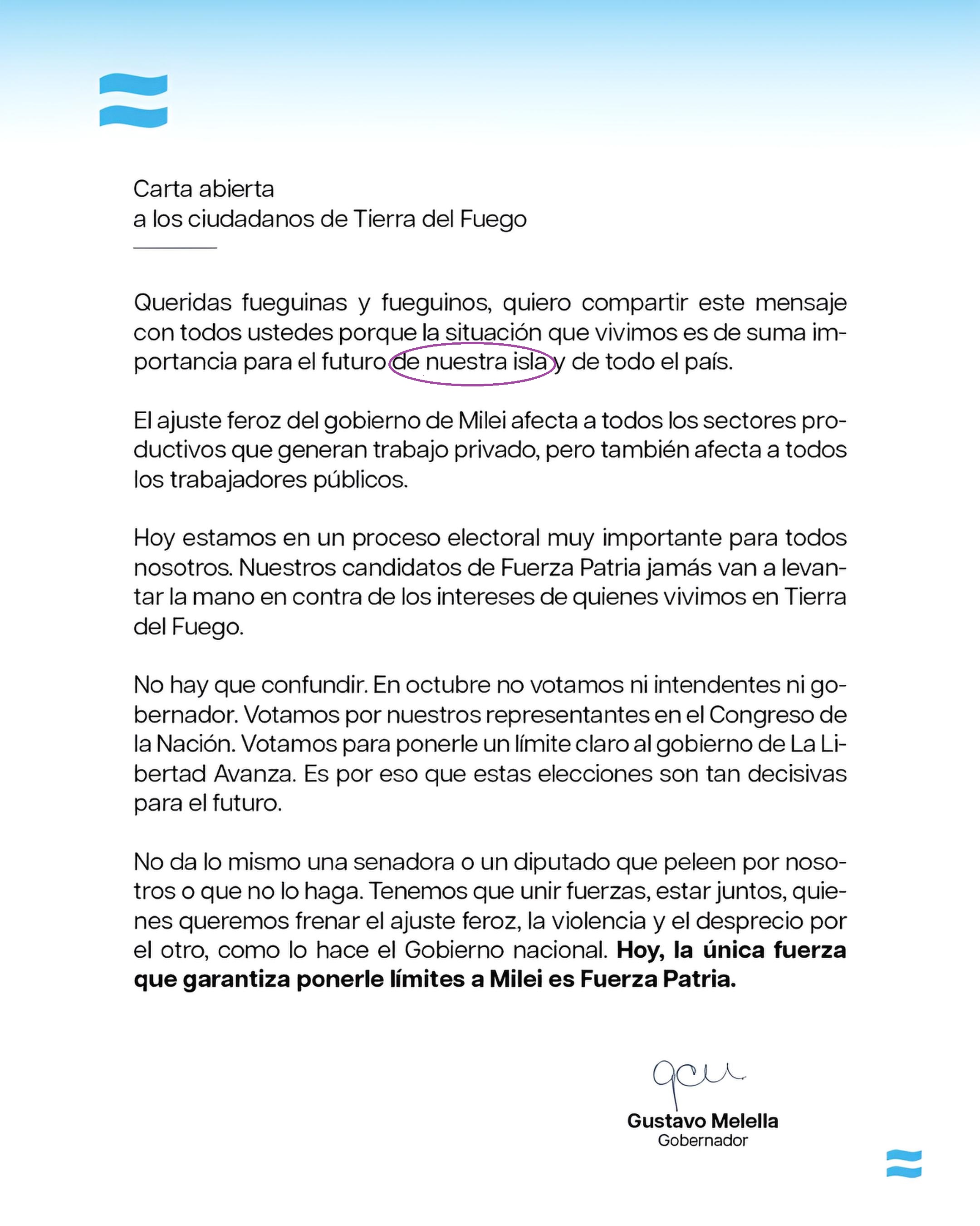 La carta de Melella, enfocada en la lucha por el "ajuste", no hace otra cosa que demostrar una decisión de gobierno claramente de renuncia de soberanía. Un gobernador que reduce su provincia a una "isla" y es incapaz de defender el nombre de su aeropuerto, mientras facilita la operación de petroleras agresoras a la soberanía y un radar con propósito contrarios al interés nacional en el territorio que gobierna, carece de la estatura necesaria para liderar la provincia más joven y emblemática de la Argentina.