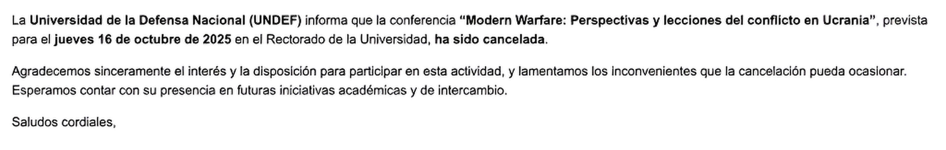 Horas más tarde, este miércoles, la Universidad de la Defensa Nacional (UNDEF) hizo oficial la suspensión del otro evento. En un escueto comunicado a docentes y alumnos, el rectorado informó la cancelación de la conferencia “Modern Warfare: Perspectivas y lecciones del conflicto en Ucrania”, prevista para el jueves 16 de octubre.