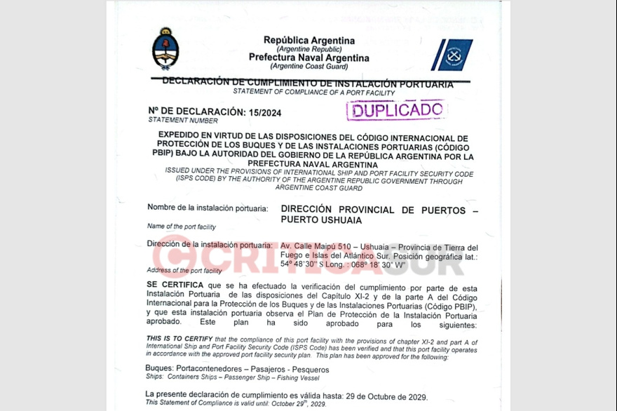El certificado exhibido por Murcia -y que el gobierno hace circularizar en los medios de prensa-, se rige por el Código PBIP (ISPS Code) y el Convenio SOLAS. En términos profesionales, esto significa que el Puerto de Ushuaia cumple con protocolos para evitar atentados terroristas, sabotajes o accesos no autorizados.