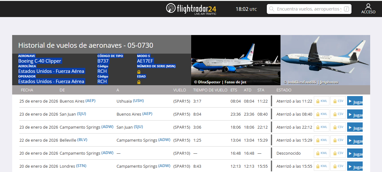 El viernes 23 a las 18:06 despegó de Andrews, y a las 22:12, aterrizó en San Juan de Puerto Rico. A las 23:36 despegó nuevamente, y a las 08:40 de ayer sábado 24, arribó al Aeroparque Jorge Newvery de la ciudad de Buenos Aires.
