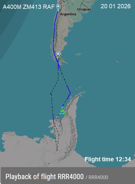 3. Martes 20 de enero: Bajo el indicativo RRR4000, el gigante cuatrimotor despega hacia la Antártida. Durante 10 horas de misión, realizó maniobras de reabastecimiento en vuelo con un avión tanque Airbus Voyager KC2 (ZZ333) y, en un acto de clara provocación, sobrevoló la Base Argentina San Martín antes de regresar a Santiago.