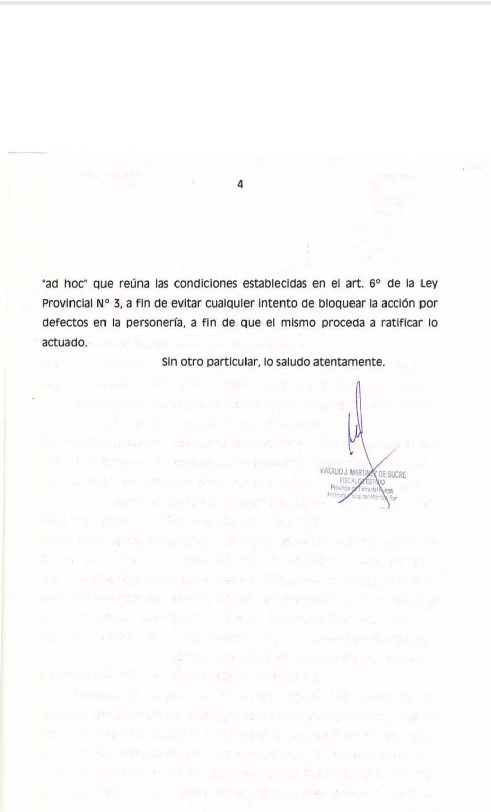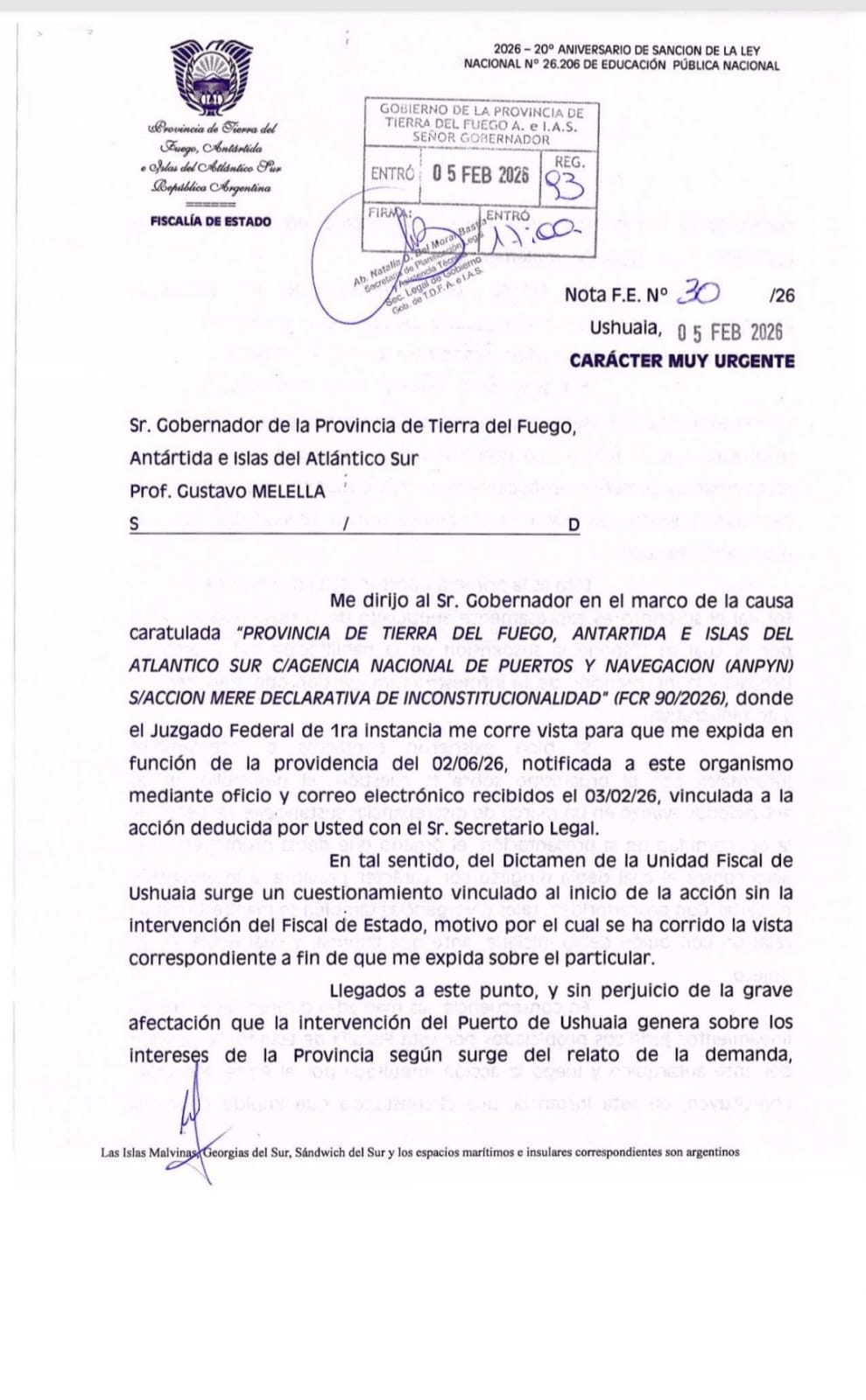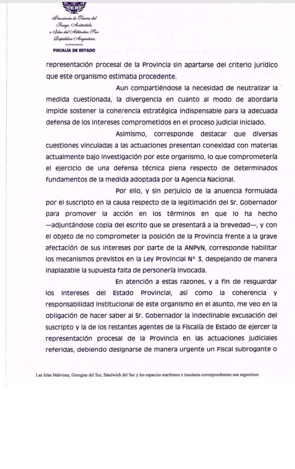 La crisis por la intervención del Puerto de Ushuaia ha derivado en un escenario sin precedentes en la historia institucional de Tierra del Fuego. El Fiscal de Estado, Dr. Virgilio Martínez de Sucre, mediante la Nota FE N.º 126, ha comunicado oficialmente su excusación indeclinable para representar a la Provincia en la demanda contra la Nación. El motivo es tan claro como alarmante: el Fiscal no solo no fue consultado a tiempo, sino que mantiene "marcadas diferencias" con la estrategia —o falta de ella— del gobernador Gustavo Melella.