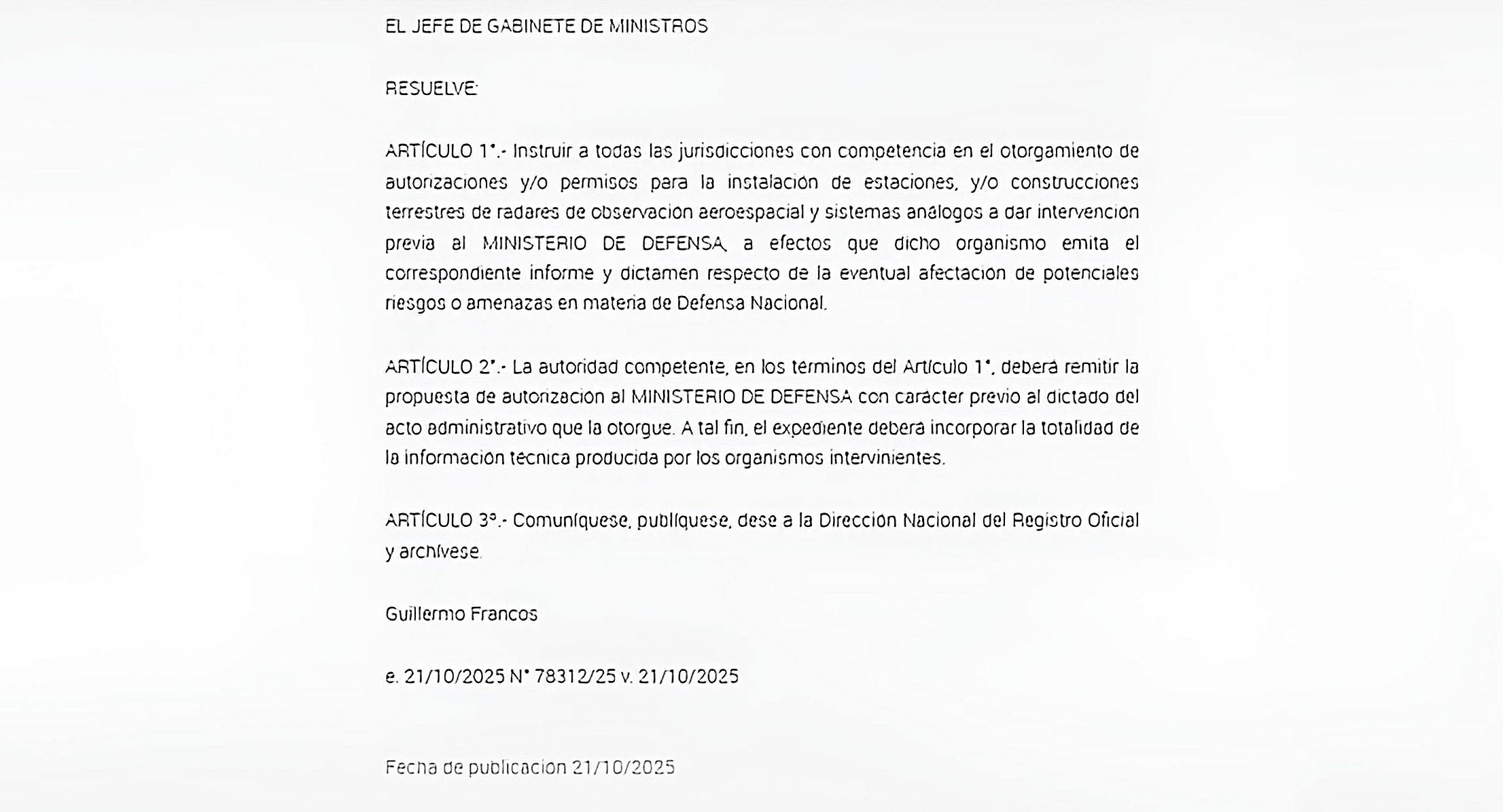 La Resolución, publicada este martes de 21 de octubre de 2025, instruye a todas las jurisdicciones competentes a requerir la intervención previa y el dictamen del Ministerio de Defensa antes de otorgar cualquier permiso para la instalación de radares de observación aeroespacial y sistemas análogos.