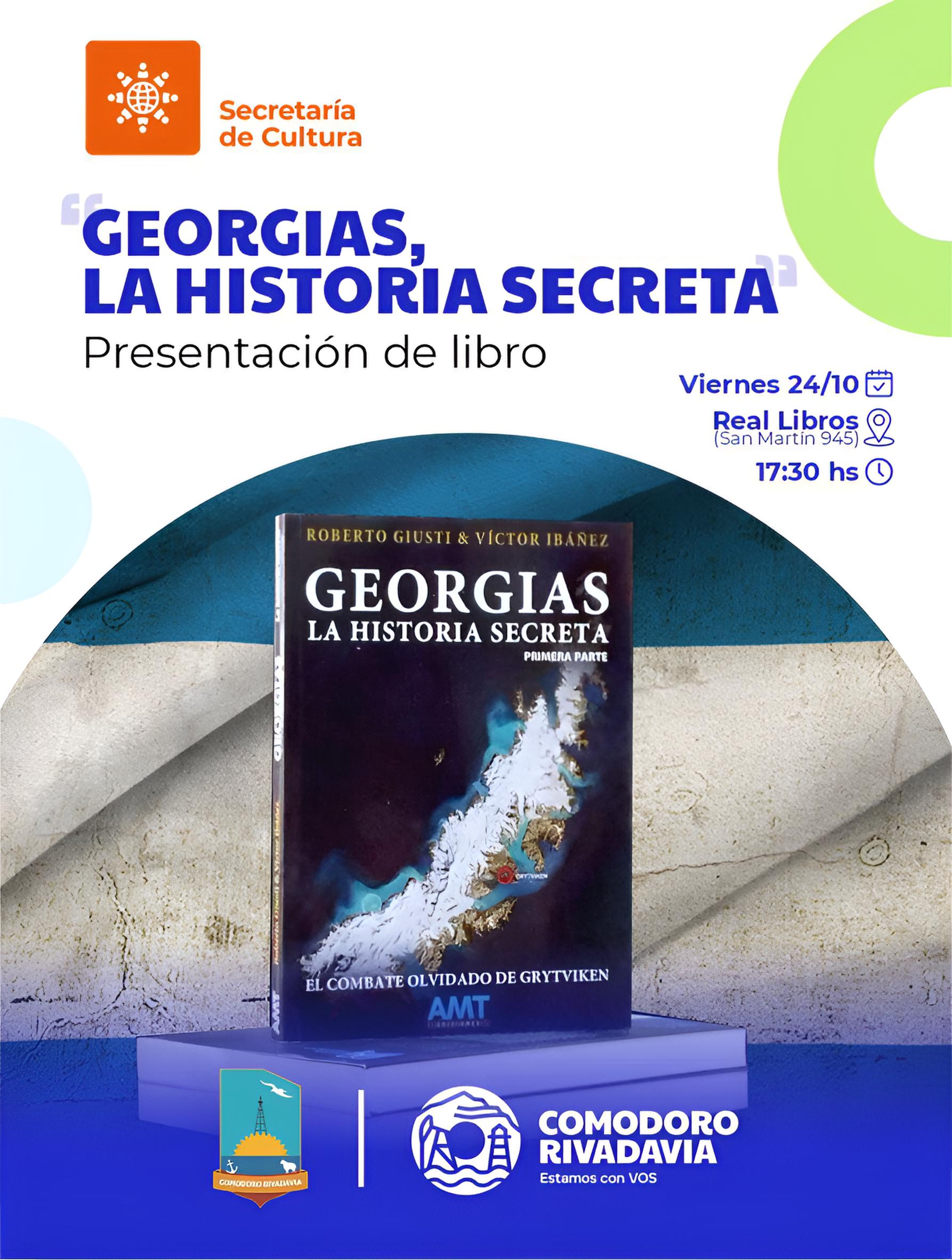 Mañana, 24 de octubre, a las 18:00 horas, en la Real Librería (San Martin 945) de la ciudad de Comodoro Rivadavia; se presentará el libro “Georgias: La historia secreta”, una obra coescrita por los Veteranos de Guerra de Malvinas (VGM) Capitán (R.E.) Roberto Giusti y Sargento Mayor (R.E.) Víctor Ibáñez. El evento, organizado por el Tiro Federal General Enrique Mosconi (TFGM) y la Unión de Ex Combatientes de Malvinas, Georgias e Islas del Atlántico Sur en Comodoro Rivadavia, cuenta con el apoyo de la Secretaría de Cultura municipal, la UNPSJB y el Ministerio de Educación provincial.